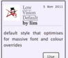Please DO copy and reuse and modify this code any way you like!CREDITS-- much owed to Amanda Bankier# to go over what's going on here--# takes out all "columns" and makes everything max-width, so dashboard is max, filters are max# and so it puts the filters at the bottom of the page# puts strong borders around some groups and buttons# makes header and footer buttons max width blocks# shows the header text instead of image# removes the blurb icons and replaces with text# enlarges the pre and textarea text by 200% so it scales in Firefox# swaps a lot of margins and padding into percentages so they don't scale up as much and crowd out the text# takes off the header and footer texture and makes it flatThere's not a lot else done with colours/images on the grounds you're probably overriding in your browser. If the skin doesn't do these things somewhere, please DO tell us via Support!